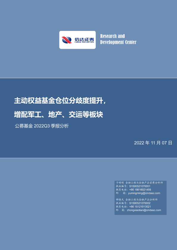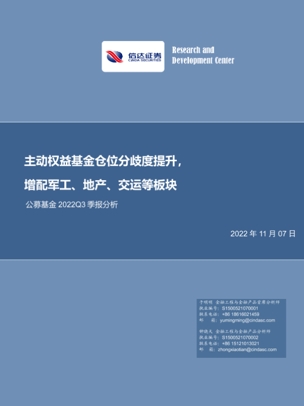 【信达证券】【20221107】公募基金2022Q3季报分析:主动权益基金仓位分歧度提升,增配军工、地产、交运等板块-30页