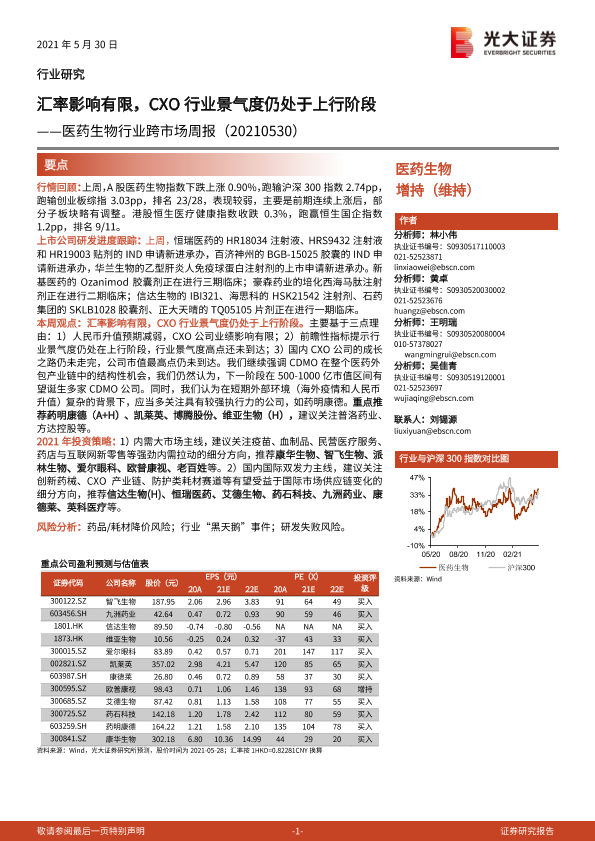 【光大证券】【20210530】医药生物行业跨市场周报:汇率影响有限,CXO行业景气度仍处于上行阶段-34页