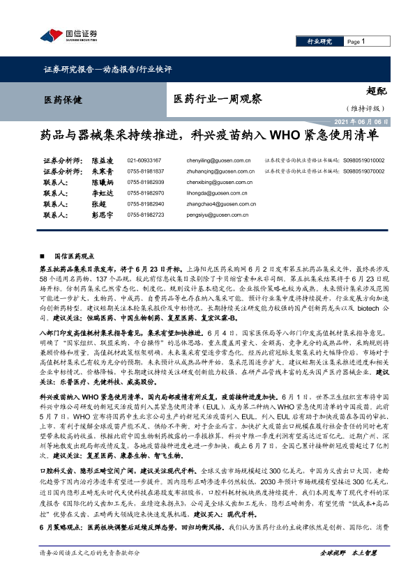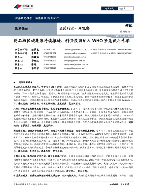 【国信证券】【20210606】医药行业一周观察:药品与器械集采持续推进,科兴疫苗纳入WHO紧急使用清单-16页