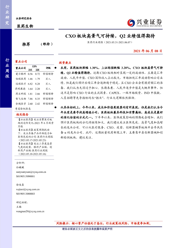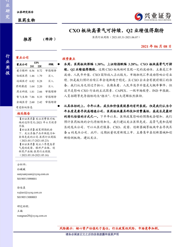 【兴业证券】【20210608】CXO板块高景气可持续,Q2业绩值得期待-12页