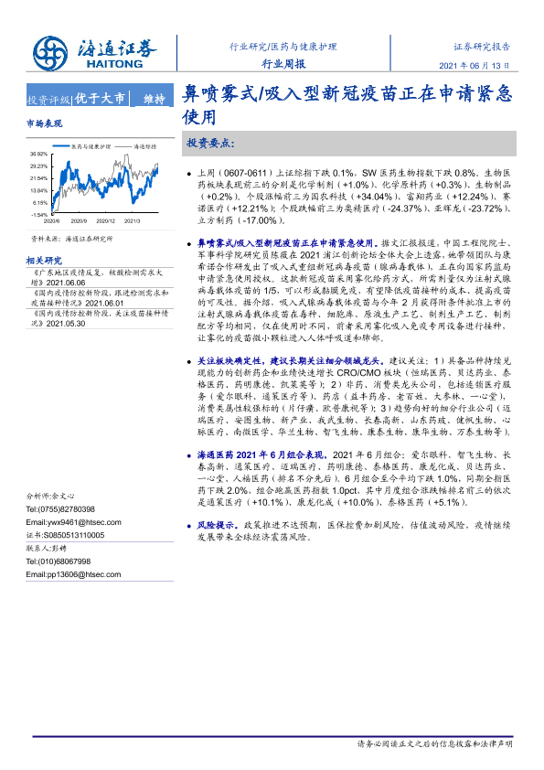 【海通证券】【20210613】医药与健康护理行业周报:鼻喷雾式吸入型新冠疫苗正在申请紧急使用-5页