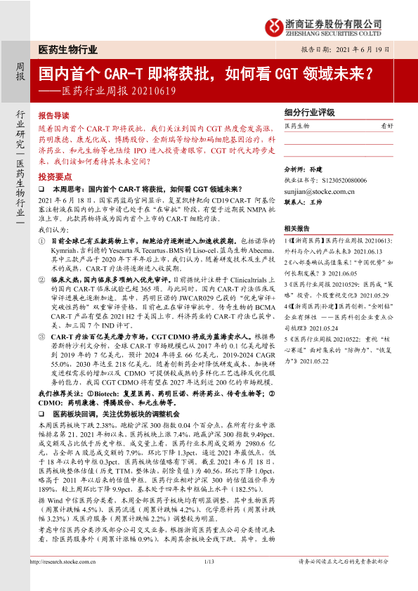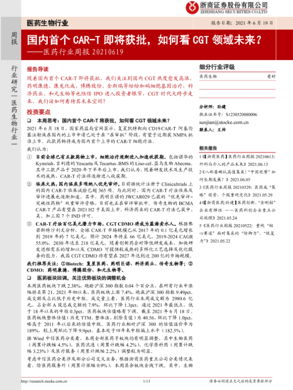 【浙商证券】【20210619】国内首个CAR-T即将获批,如何看CGT领域未来-13页