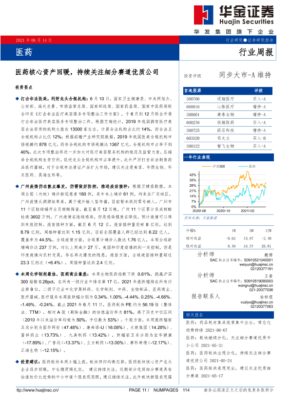 【华金证券】【20210614】医药行业周报:医药核心资产回暖,持续关注细分赛道优质公司-15页