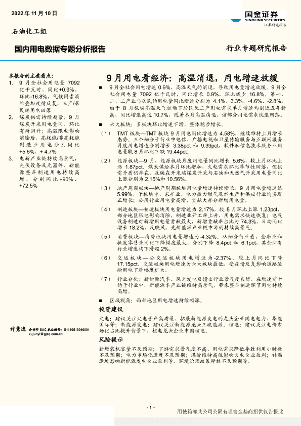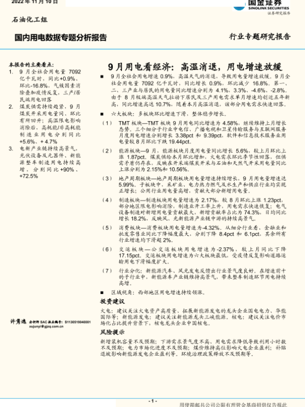 【国金证券】【20221110】公用事业行业国内用电数据专题分析报告:9月用电看经济,高温消退,用电增速放缓-18页