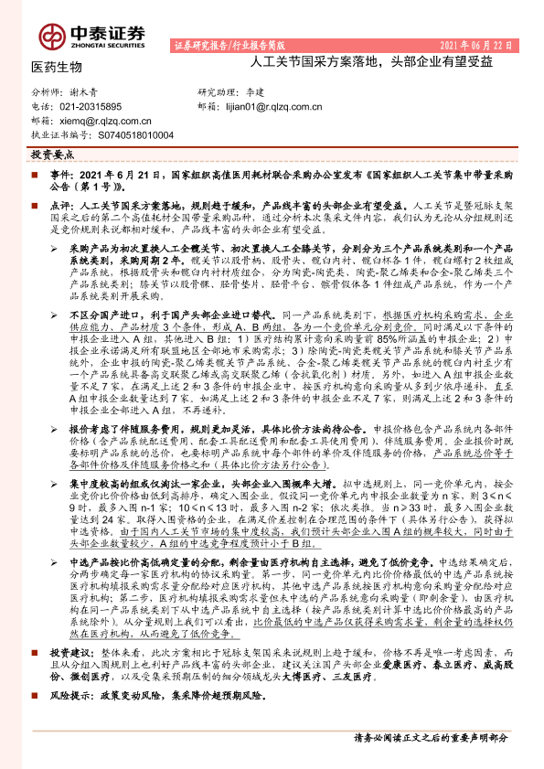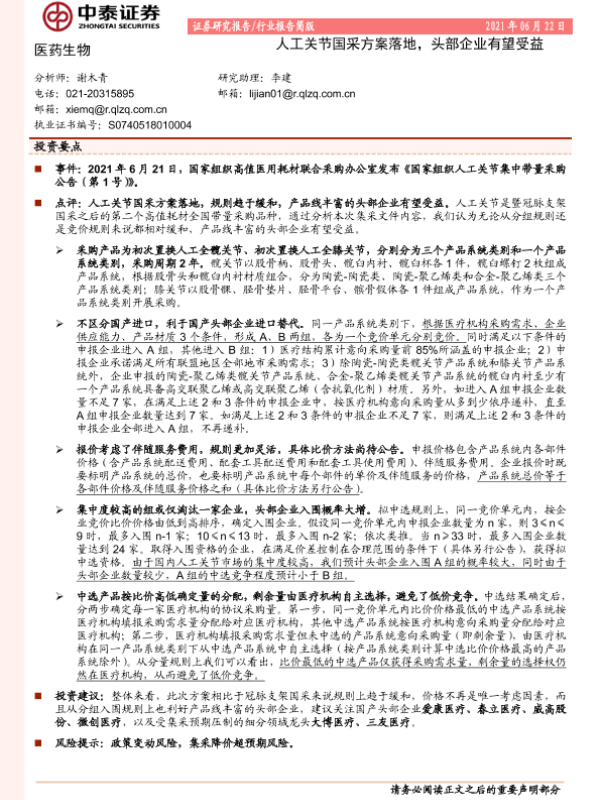 【中泰证券】【20210622】医药生物:人工关节国采方案落地,头部企业有望受益-3页