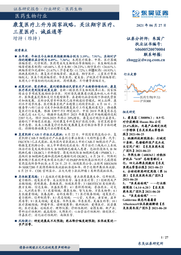 【东吴证券】【20210627】医药生物行业跟踪周报:康复医疗上升为国家战略,关注翔宇医疗、三星医疗、诚益通等-27页