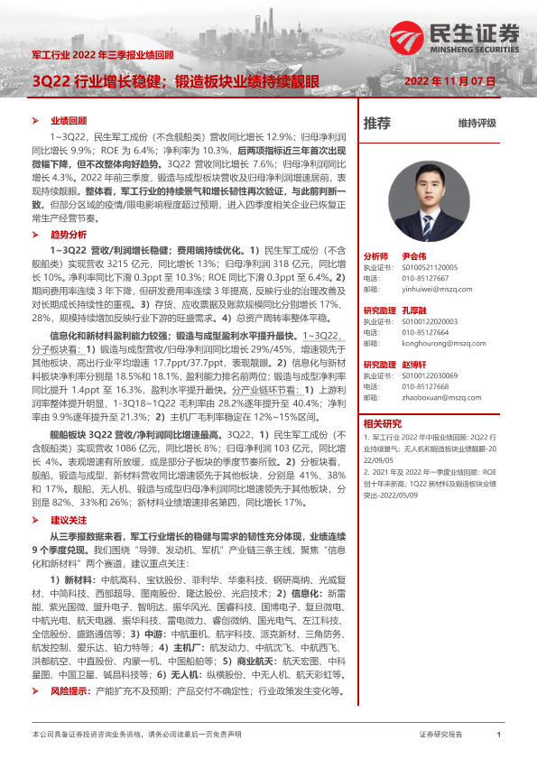 【民生证券】【20221107】军工行业2022年三季报业绩回顾:3Q22行业增长稳健;锻造板块业绩持续靓眼-17页