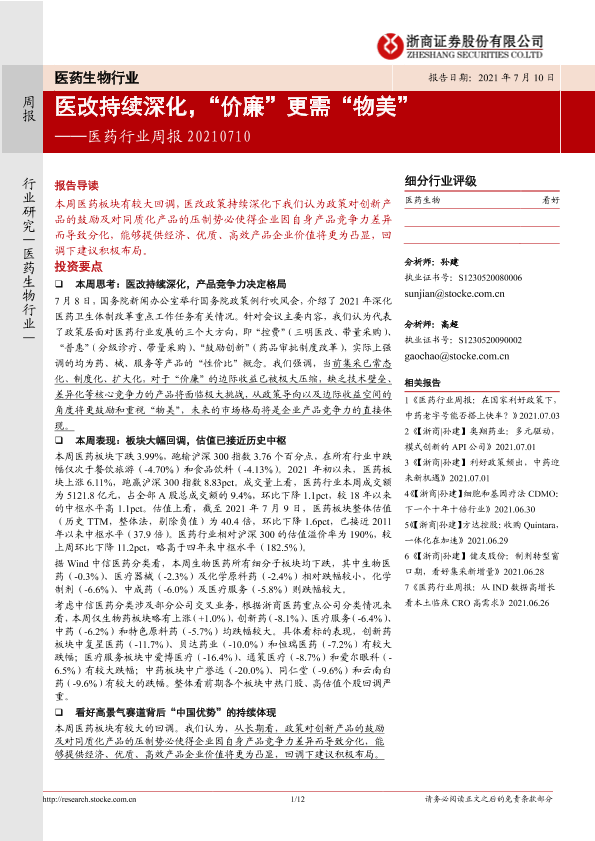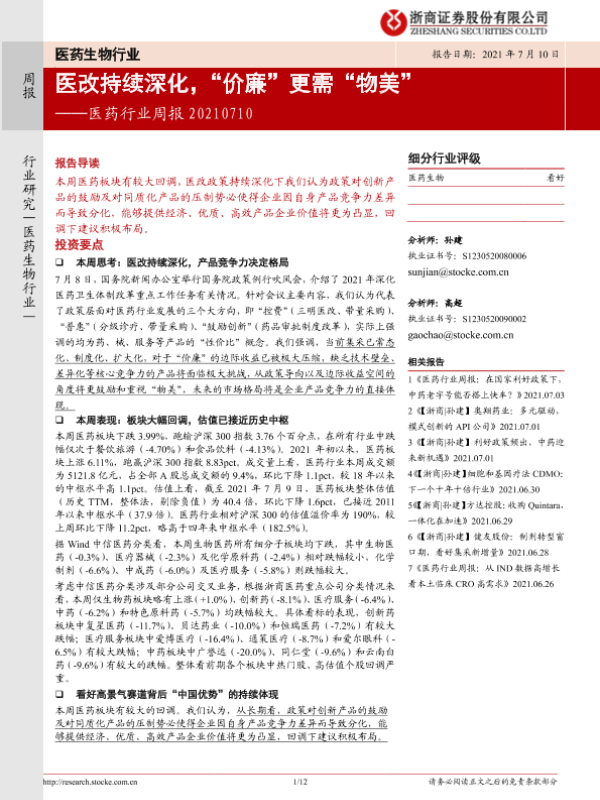 【浙商证券】【20210710】医药行业周报:医改持续深化,“价廉”更需“物美”-12页