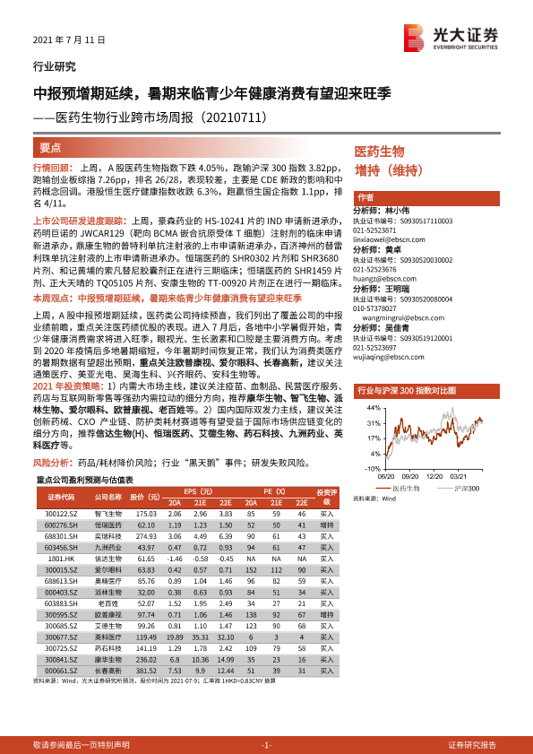 【光大证券】【20210711】医药生物行业跨市场周报:中报预增期延续,暑期来临青少年健康消费有望迎来旺季-27页