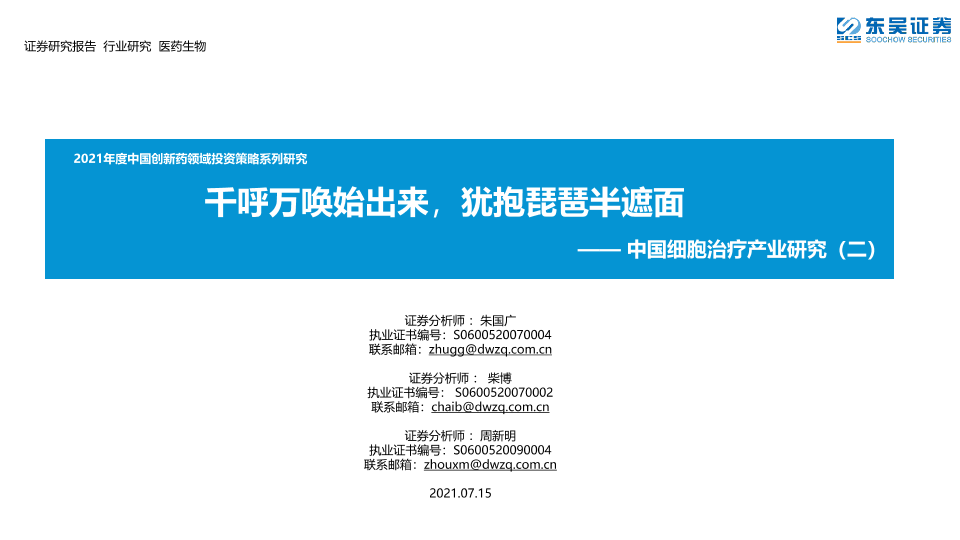 【东吴证券】【20210715】2021年度中国创新药领域投资策略系列研究:中国细胞治疗产业研究(二)-64页