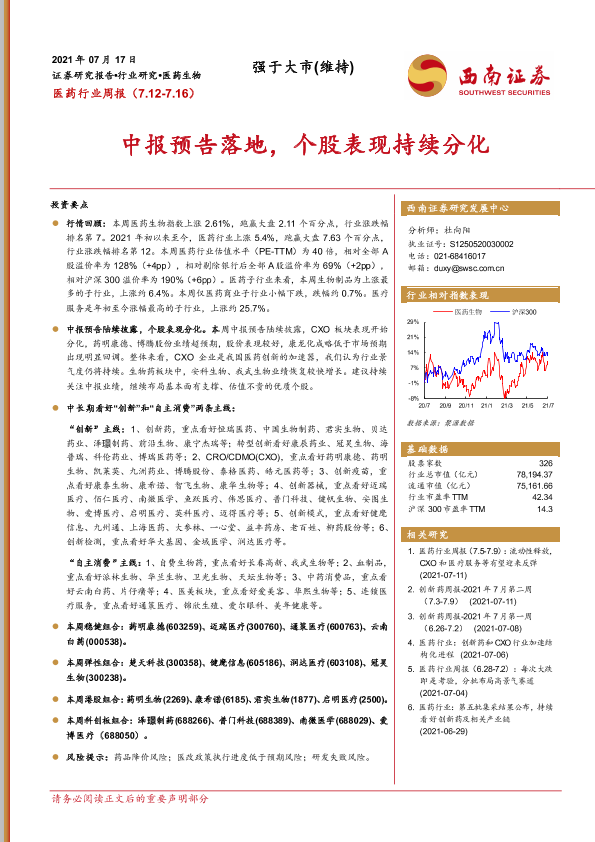 【西南证券】【20210717】医药行业周报:中报预告落地,个股表现持续分化-33页