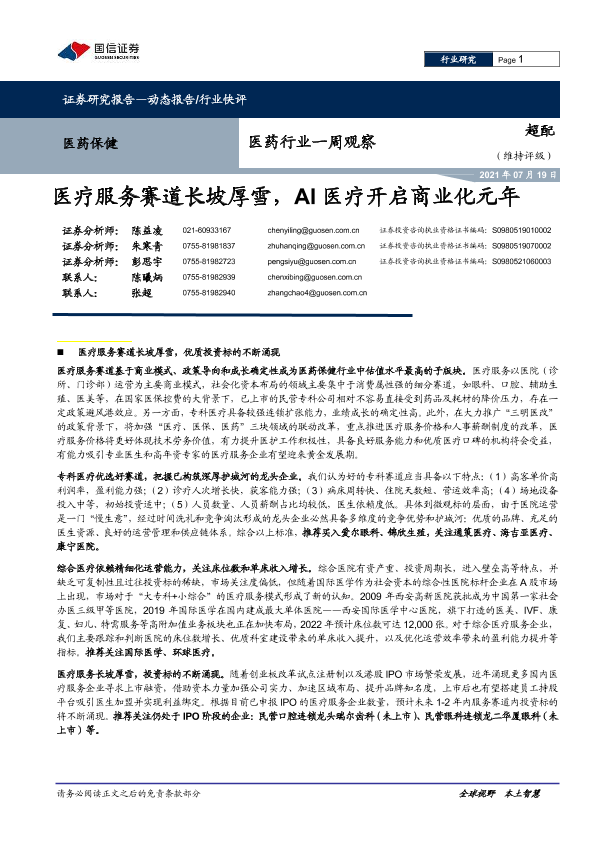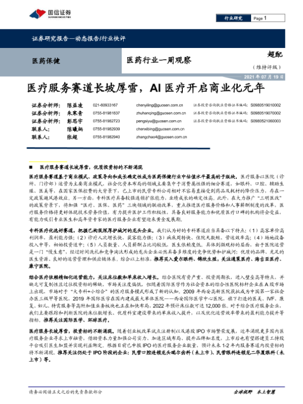 【国信证券】【20210719】医药行业一周观察:医疗服务赛道长坡厚雪,AI医疗开启商业化元年-15页
