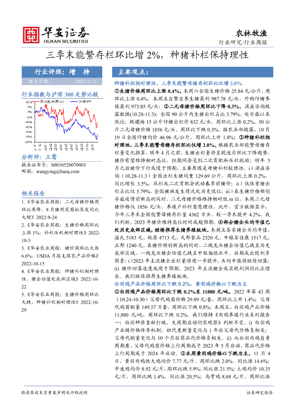 【华安证券】【20221105】农林牧渔行业周报:三季末能繁存栏环比增2%,种猪补栏保持理性-39页