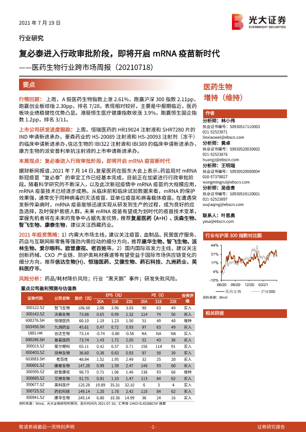 【光大证券】【20210719】医药生物行业跨市场周报:复必泰进入行政审批阶段,即将开启mRNA疫苗新时代-27页