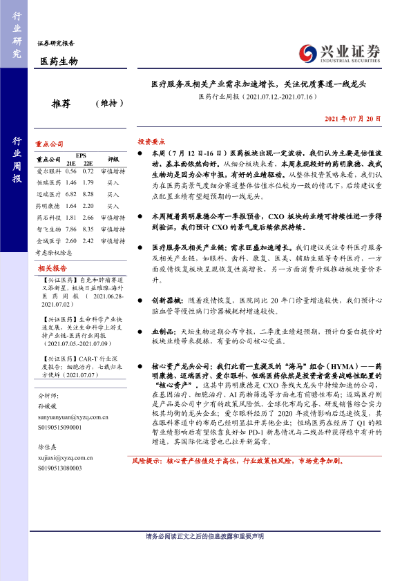 【兴业证券】【20210720】医药行业周报:医疗服务及相关产业需求加速增长,关注优质赛道一线龙头-12页