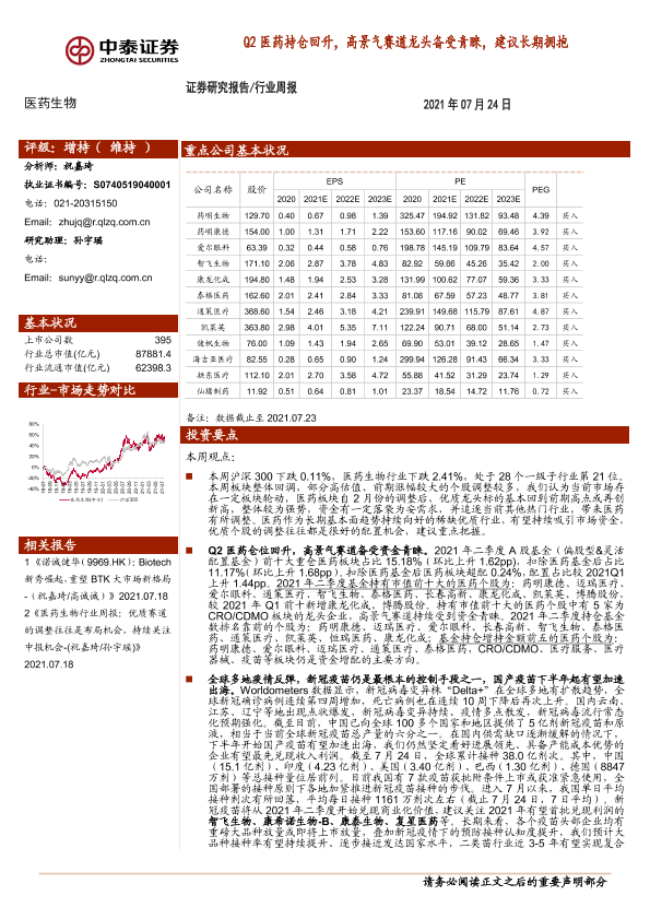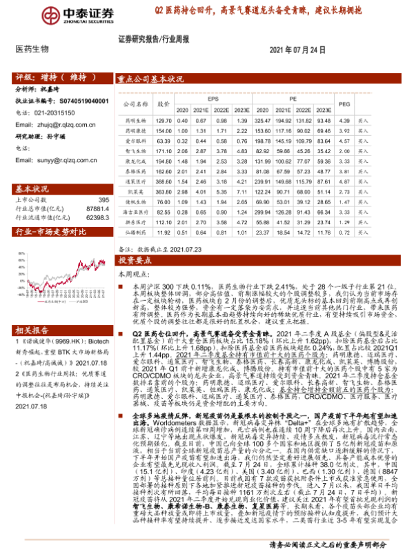 【中泰证券】【20210724】医药生物行业周报:Q2医药持仓回升,高景气赛道龙头备受青睐,建议长期拥抱-12页