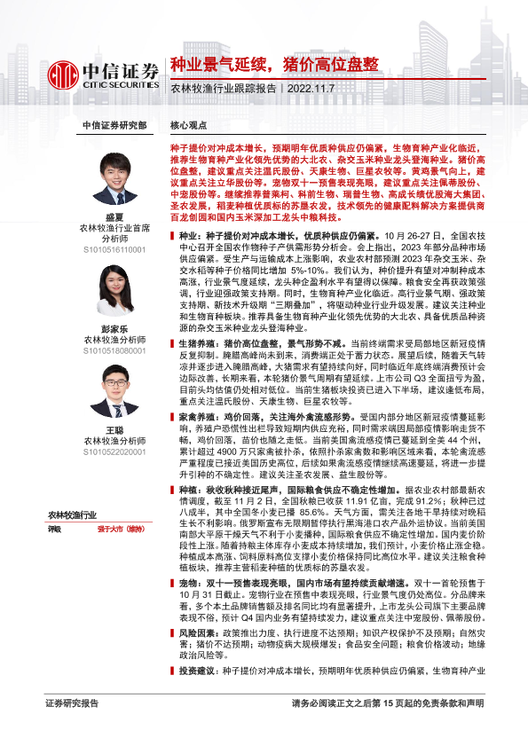 【中信证券】【20221107】农林牧渔行业跟踪报告:种业景气延续,猪价高位盘整-16页