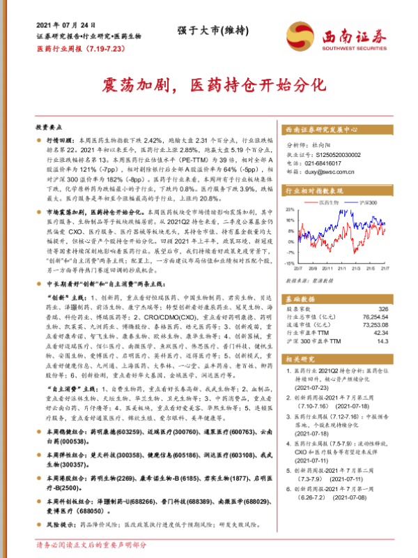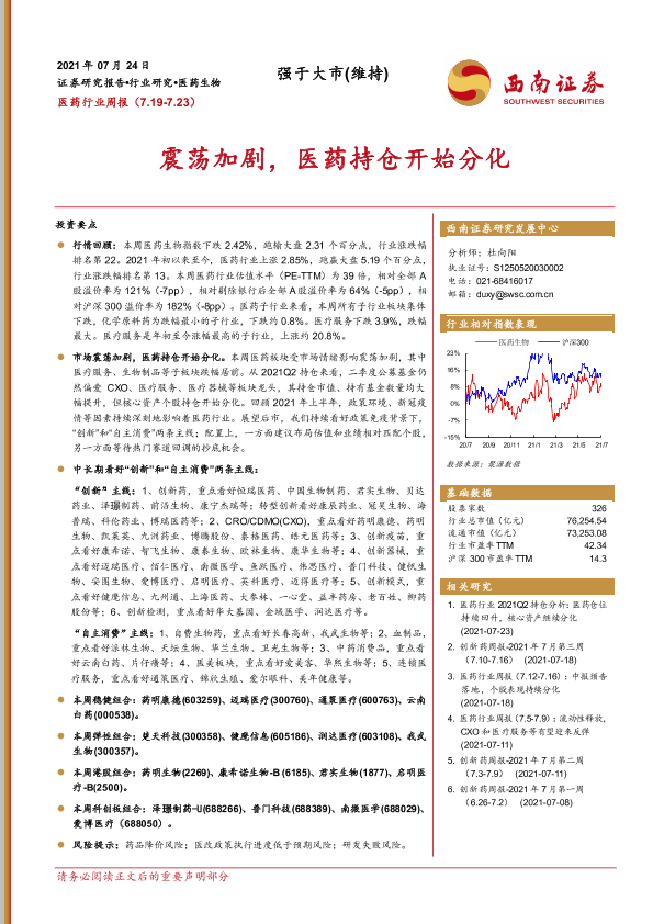 【西南证券】【20210724】医药行业周报:震荡加剧,医药持仓开始分化-34页