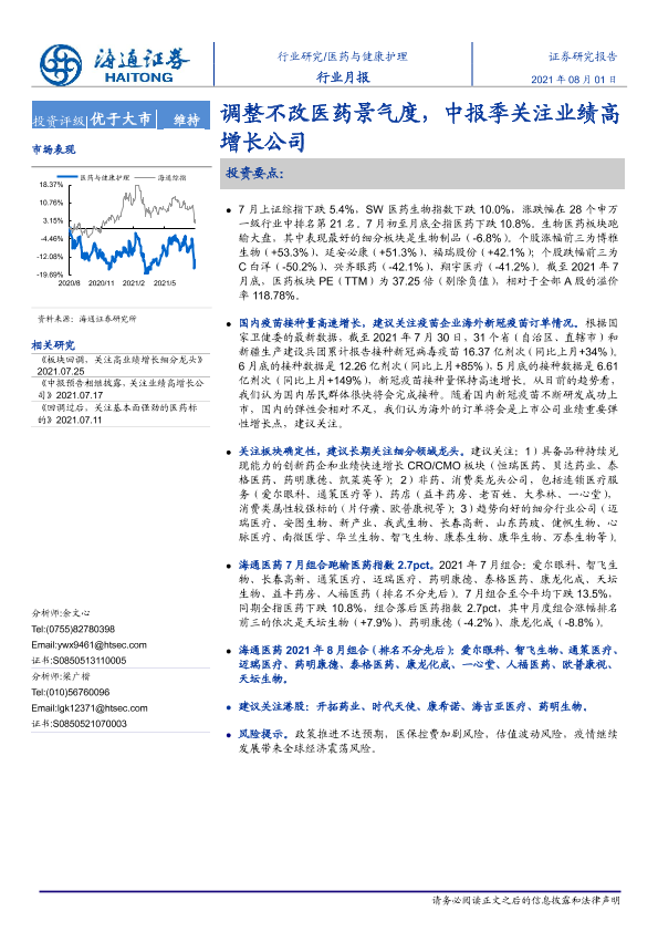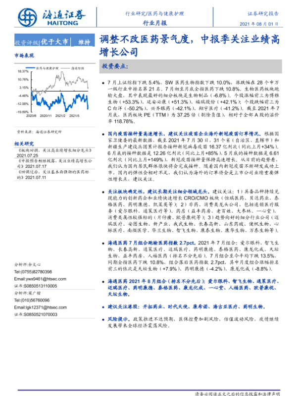 【海通证券】【20210801】医药与健康护理行业月报:调整不改医药景气度,中报季关注业绩高增长公司-5页