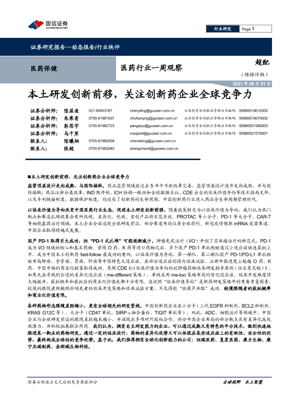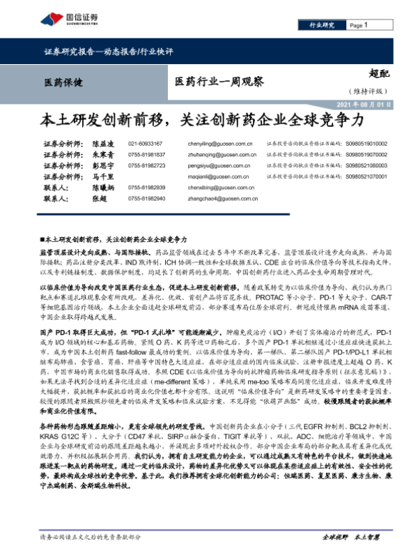 【国信证券】【20210801】医药行业一周观察:本土研发创新前移,关注创新药企业全球竞争力-13页