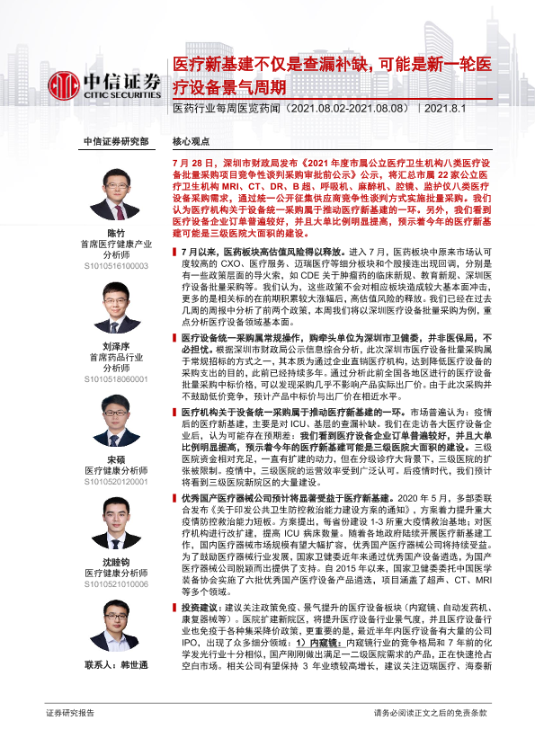【中信证券】【20210801】医药行业每周医览药闻:医疗新基建不仅是查漏补缺,可能是新一轮医疗设备景气周期-19页