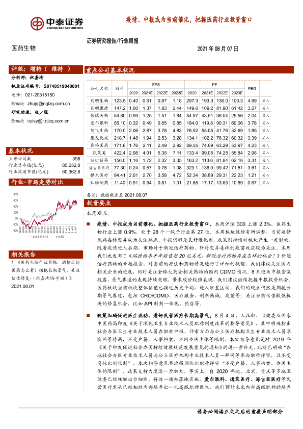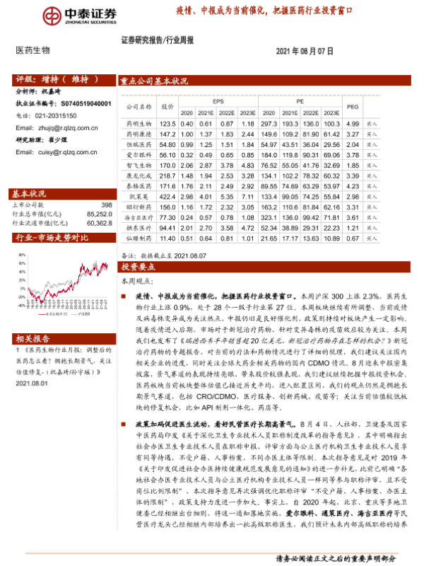 【中泰证券】【20210807】医药生物行业周报:疫情、中报成为当前催化,把握医药行业投资窗口-11页