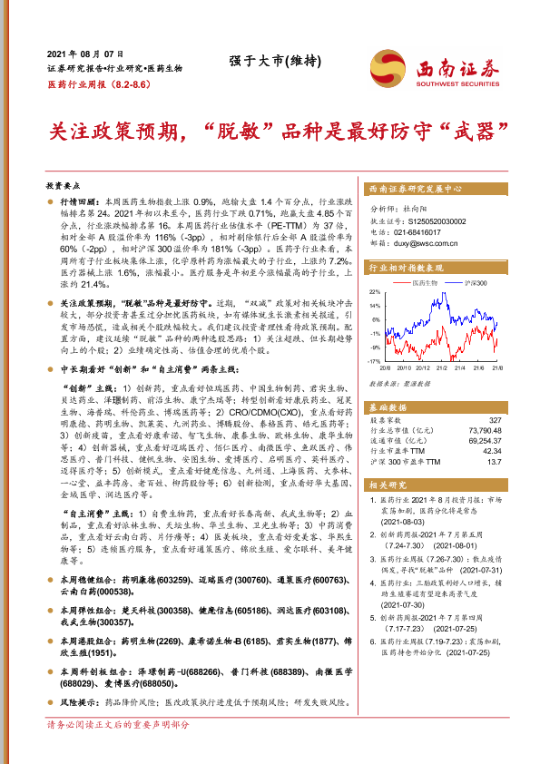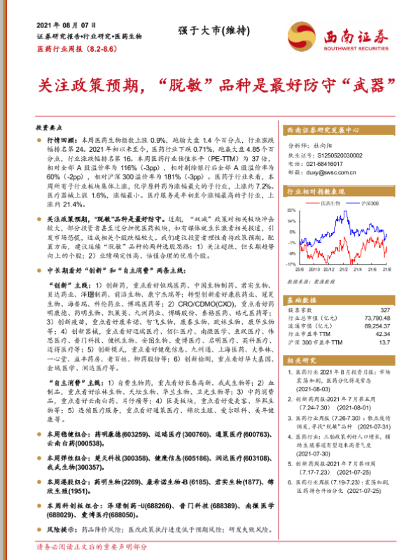 【西南证券】【20210807】医药行业周报:关注政策预期,“脱敏”品种是最好防守“武器”-34页