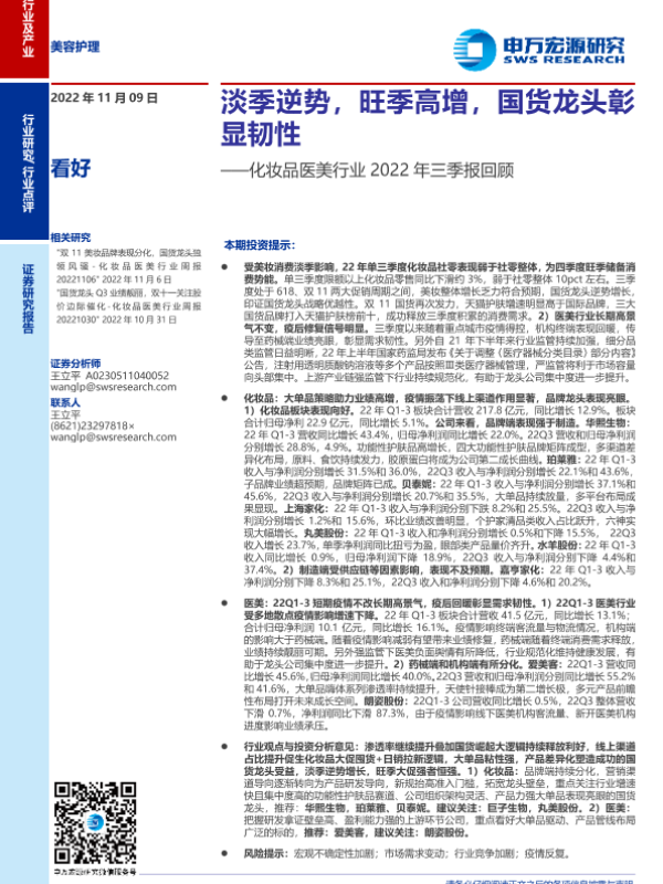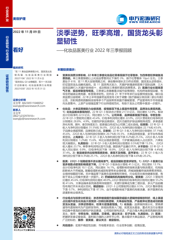 【申万宏源】【20221109】化妆品医美行业2022年三季报回顾:淡季逆势,旺季高增,国货龙头彰显韧性-15页