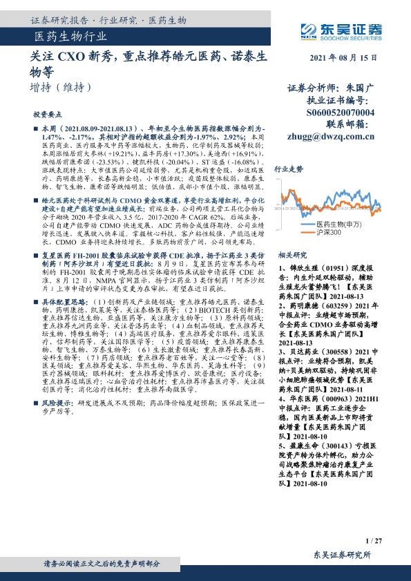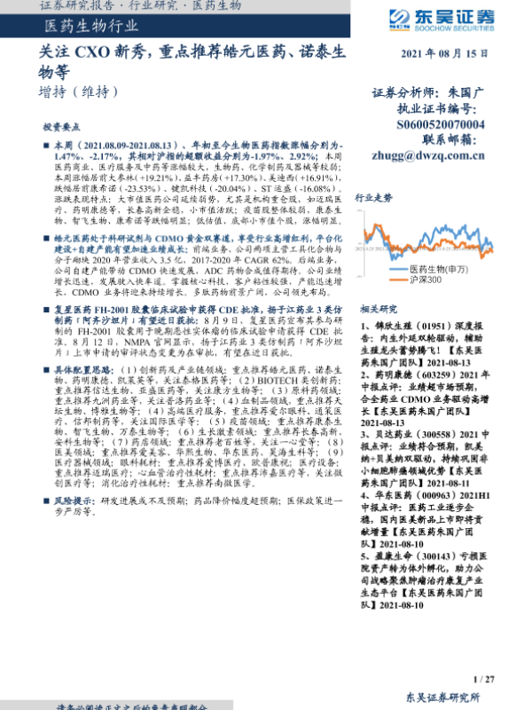 【东吴证券】【20210815】医药生物行业:关注CXO新秀,重点推荐皓元医药、诺泰生物等-27页