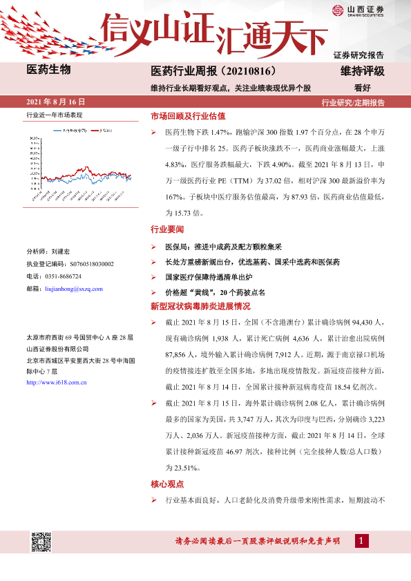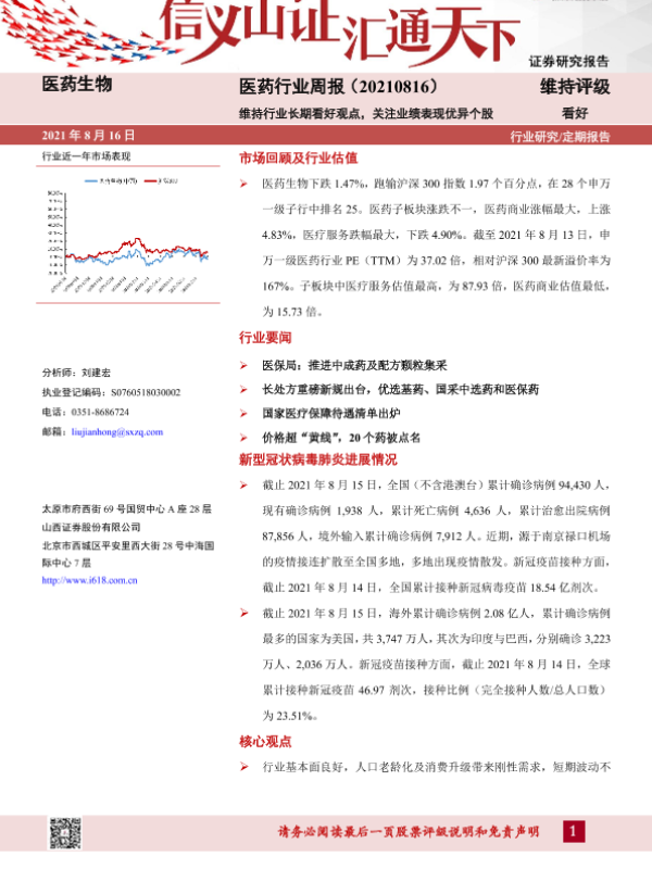 【山西证券】【20210816】医药行业周报:维持行业长期看好观点,关注业绩表现优异个股-9页