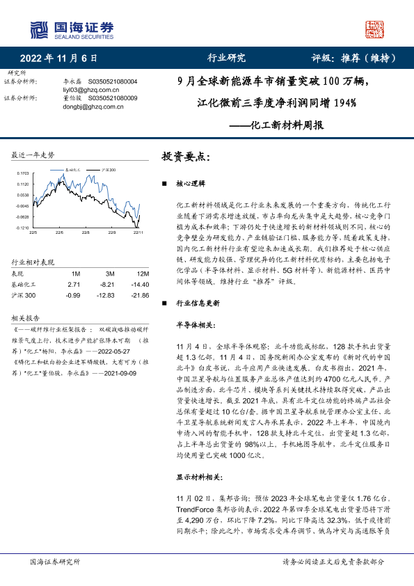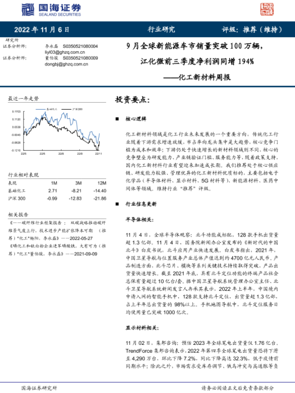 【国海证券】【20221106】化工新材料周报:9月全球新能源车市销量突破100万辆,江化微前三季度净利润同增194%-39页
