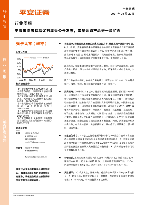 【平安证券】【20210822】生物医药行业周报:安徽省临床检验试剂集采公告发布,带量采购产品进一步扩面-6页