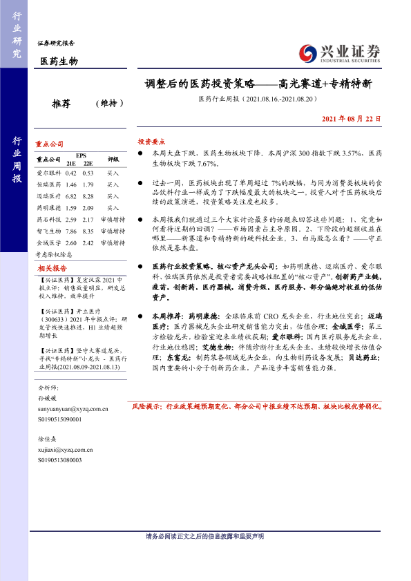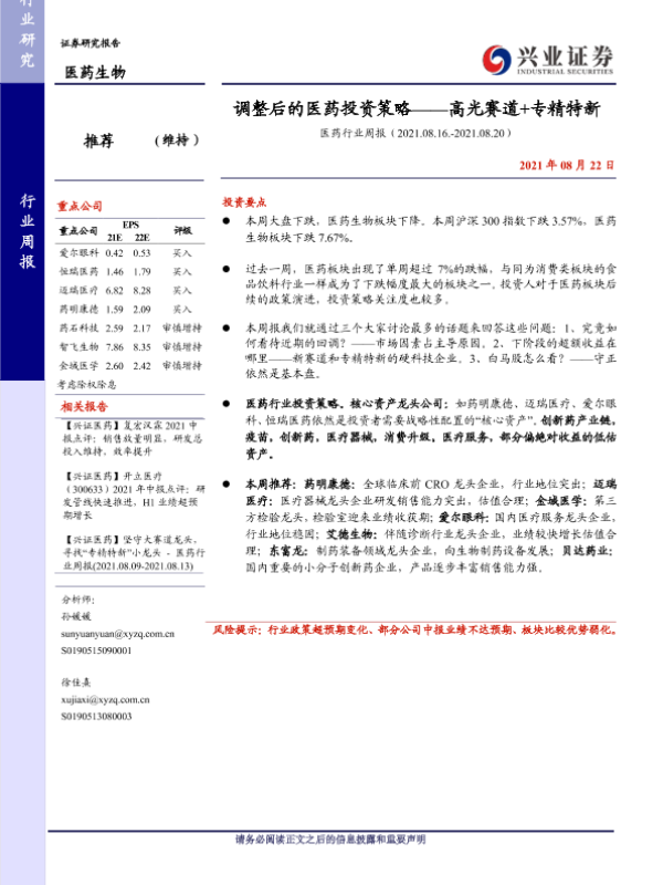 【兴业证券】【20210822】调整后的医药投资策略——高光赛道+专精特新-13页