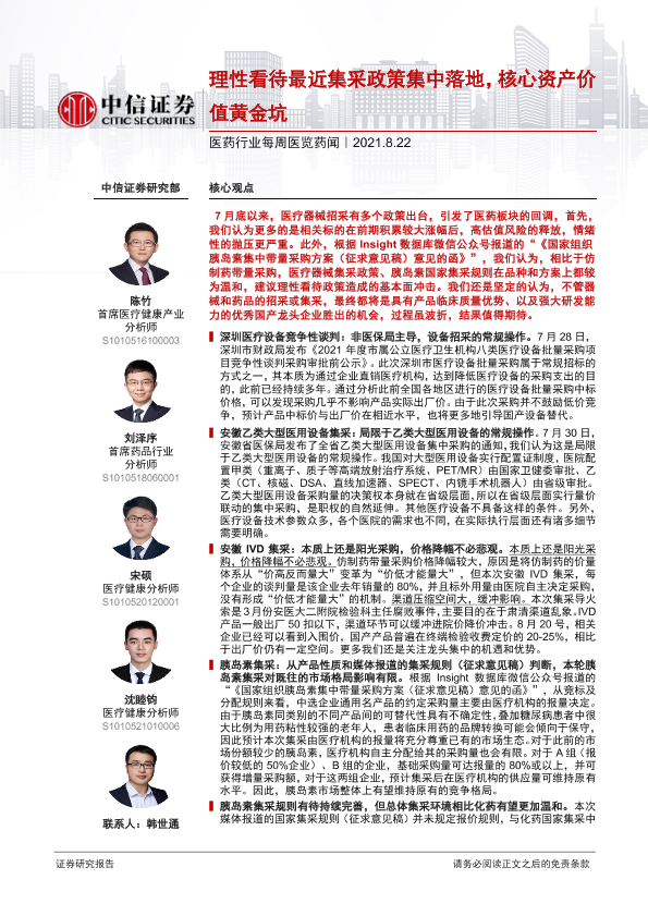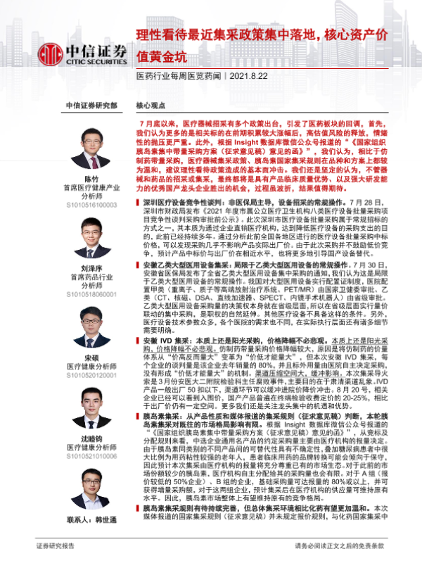 【中信证券】【20210822】医药行业每周医览药闻:理性看待最近集采政策集中落地,核心资产价值黄金坑-27页
