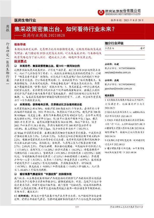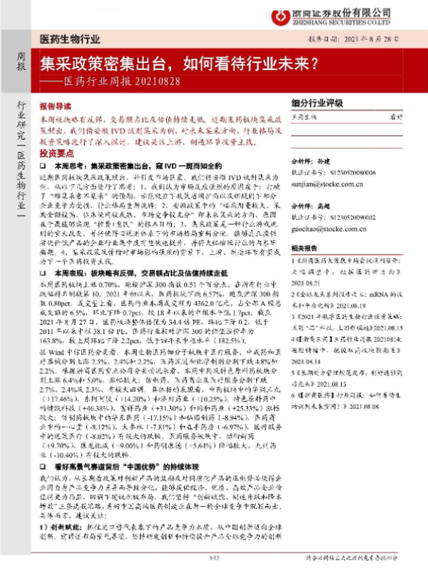 【浙商证券】【20210828】医药行业周报:集采政策密集出台,如何看待行业未来?-12页