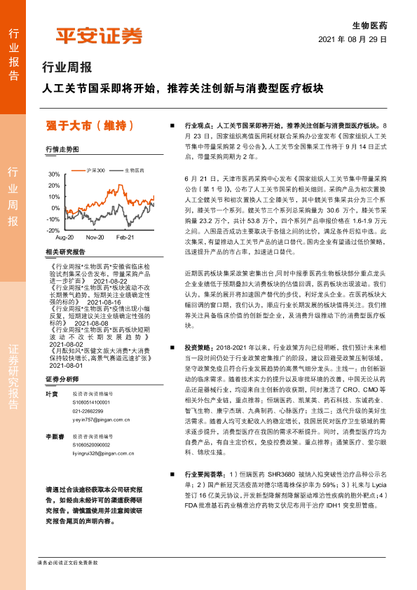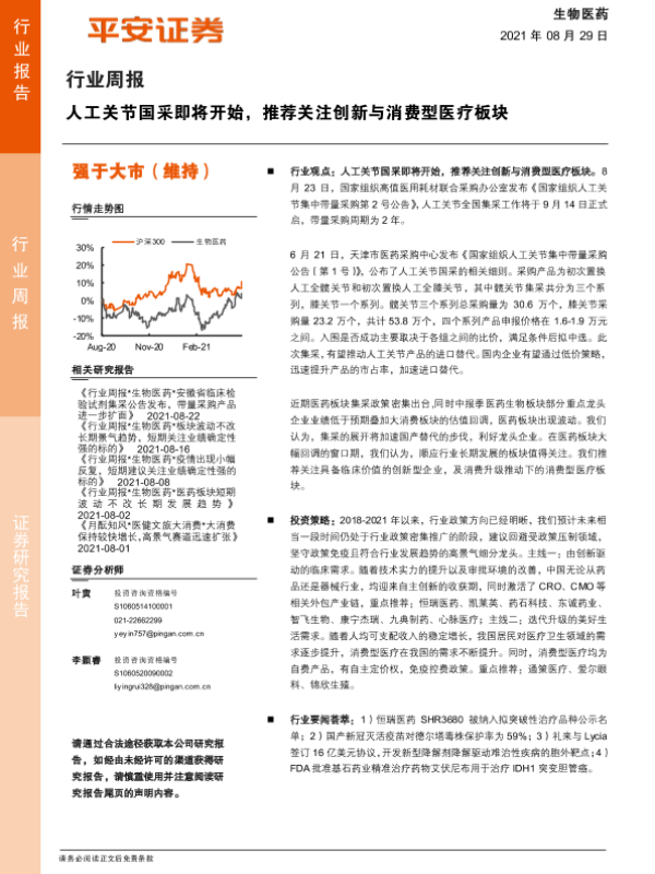 【平安证券】【20210829】人工关节国采即将开始,推荐关注创新与消费型医疗板块-7页