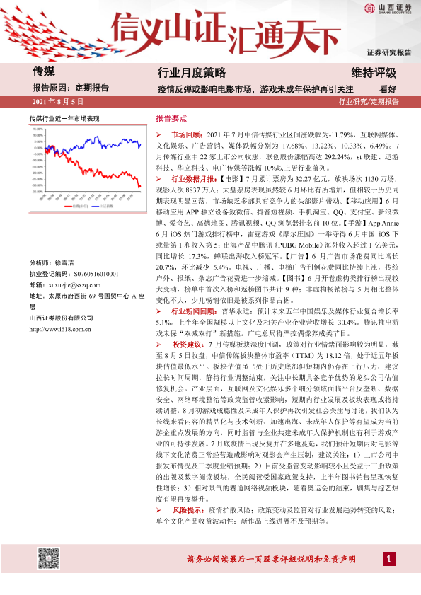 【山西证券】【20210805】传媒行业月度策略:疫情反弹或影响电影市场,游戏未成年保护再引关注-24页