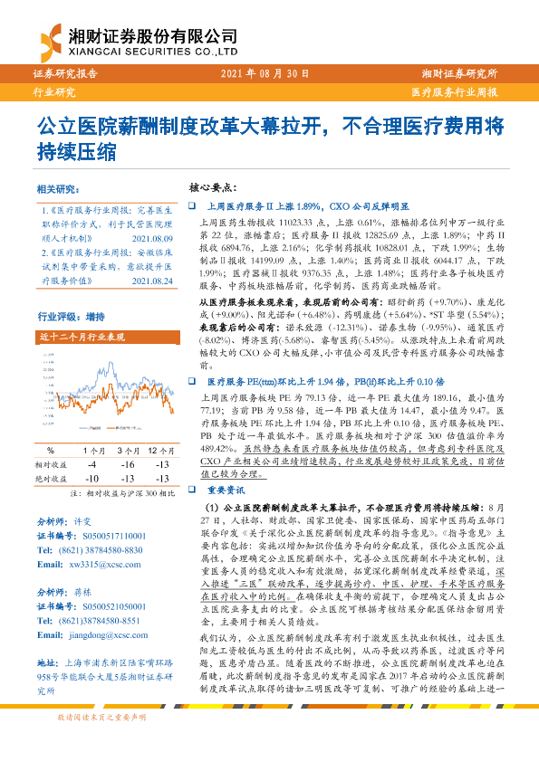 【湘财证券】【20210830】医疗服务行业周报:公立医院薪酬制度改革大幕拉开,不合理医疗费用将持续压缩-10页