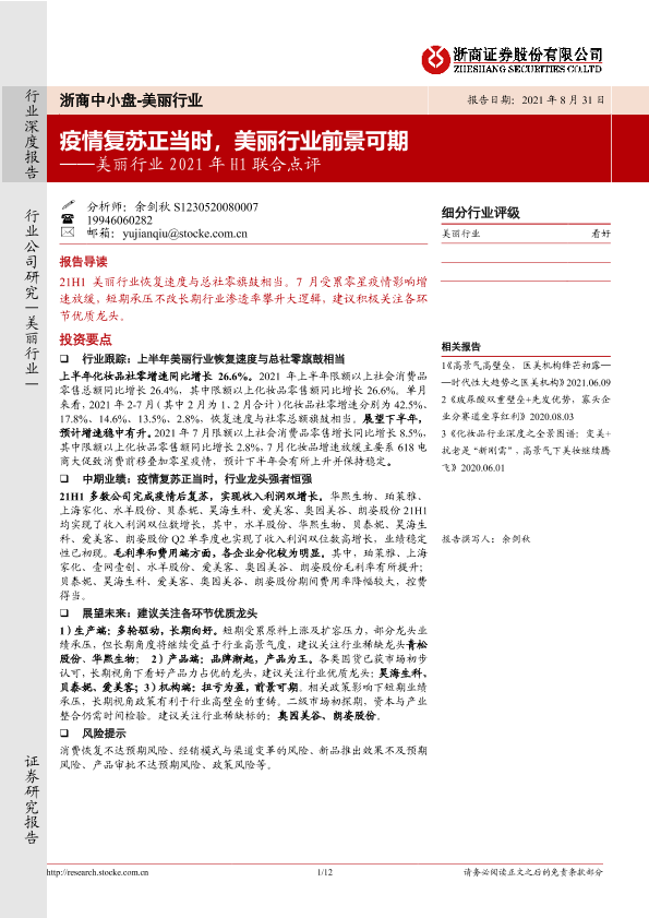 【浙商证券】【20210831】美丽行业2021年H1联合点评:疫情复苏正当时,美丽行业前景可期-12页