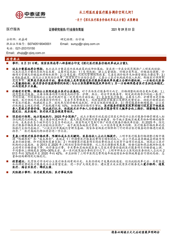 【中泰证券】【20210901】关于《深化医疗服务价格改革试点方案》政策解读:从三明医改看医疗服务调价空间几何?-7页