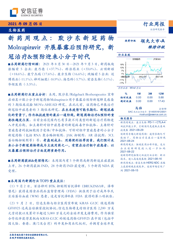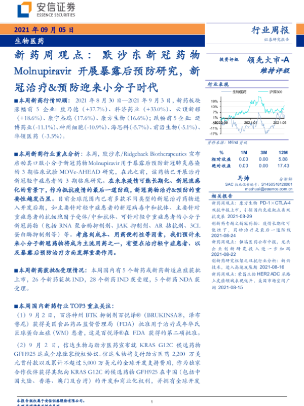 【安信证券】【20210905】新药周观点:默沙东新冠药物Molnupiravir开展暴露后预防研究-15页