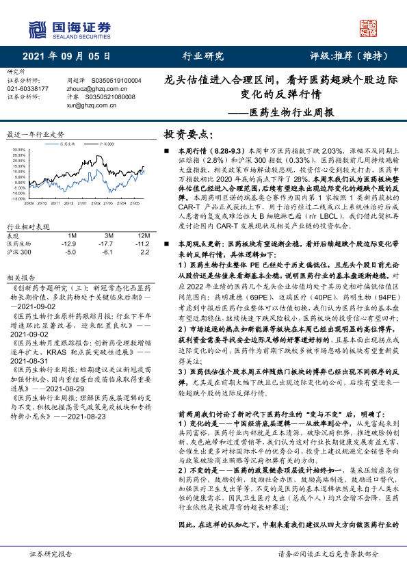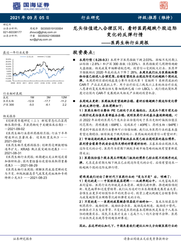 【国海证券】【20210905】医药生物行业周报:龙头估值进入合理区间,看好医药超跌个股边际变化的反弹行情-13页