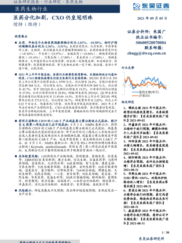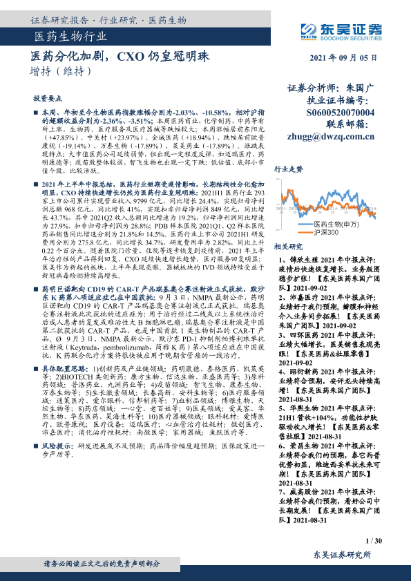 【东吴证券】【20210905】医药生物行业:医药分化加剧,CXO仍皇冠明珠-30页