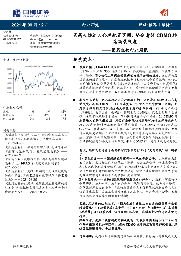 【国海证券】【20210912】医药生物行业周报:医药板块进入合理配置区间,坚定看好CDMO持续高景气度-10页
