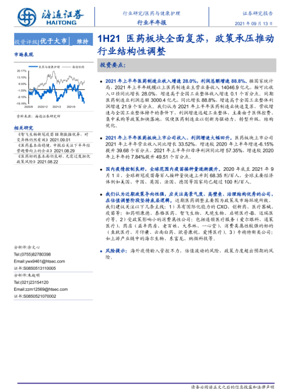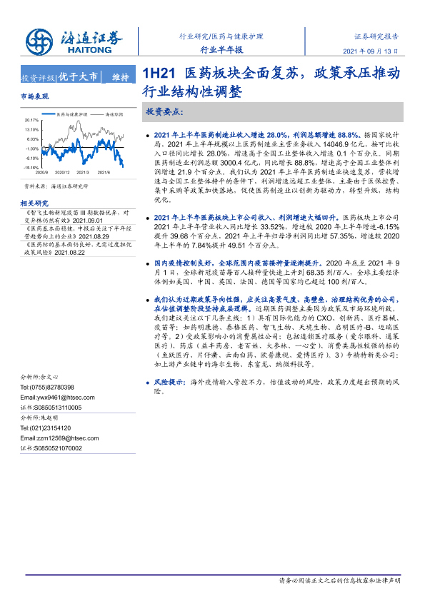 【海通证券】【20210913】1H21医药板块全面复苏,政策承压推动行业结构性调整-10页