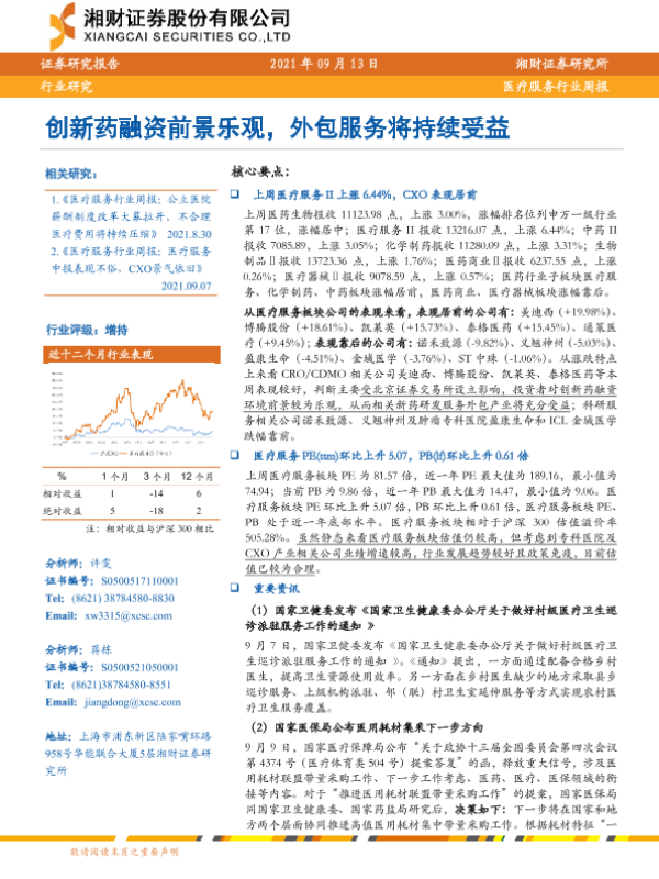 【湘财证券】【20210913】医疗服务行业周报:创新药融资前景乐观,外包服务将持续受益-9页