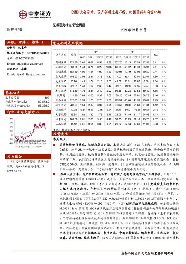 【中泰证券】【20210921】医药生物行业周报:ESMO大会召开、国产创新进展不断,把握医药布局窗口期-13页