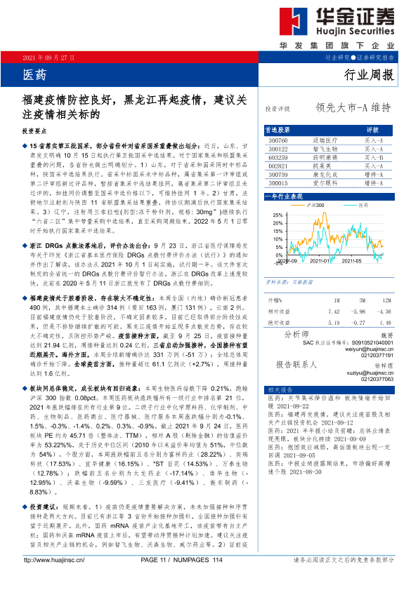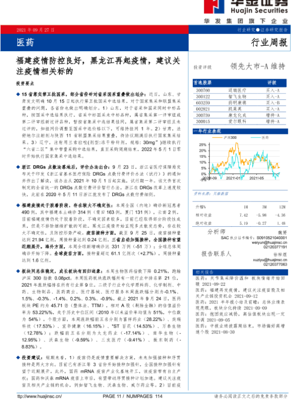 【华金证券】【20210927】医药行业周报:福建疫情防控良好,黑龙江再起疫情,建议关注疫情相关标的-20页
