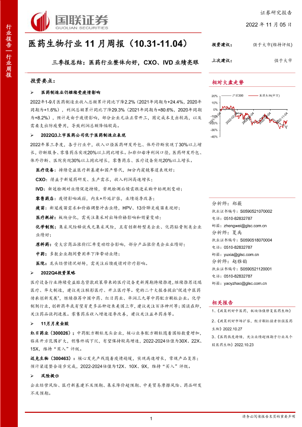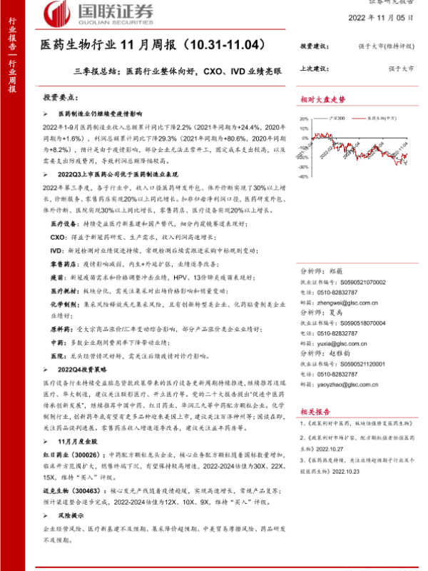 【国联证券】【20221105】医药生物行业11月周报:三季报总结,医药行业整体向好,CXO、IVD业绩亮眼-28页