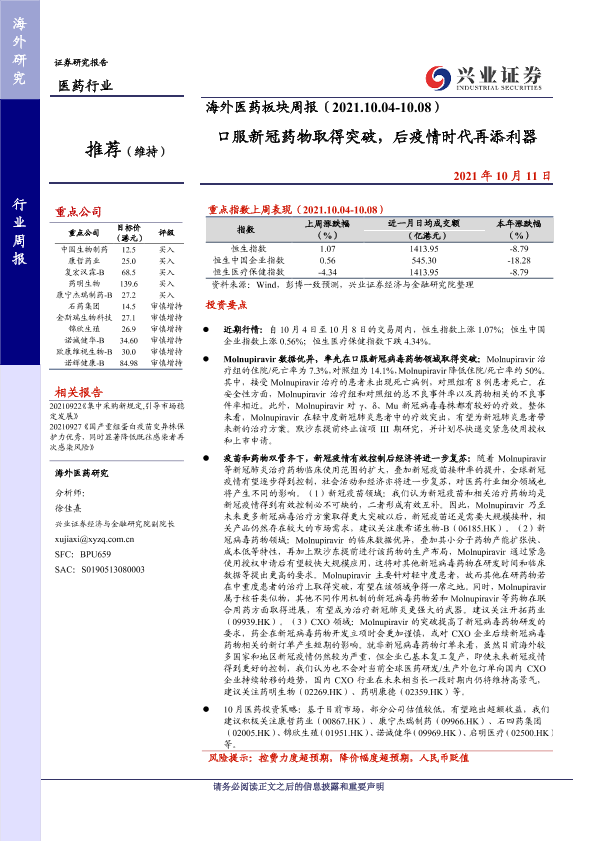 【兴业证券】【20211011】海外医药板块周报:口服新冠药物取得突破,后疫情时代再添利器-14页